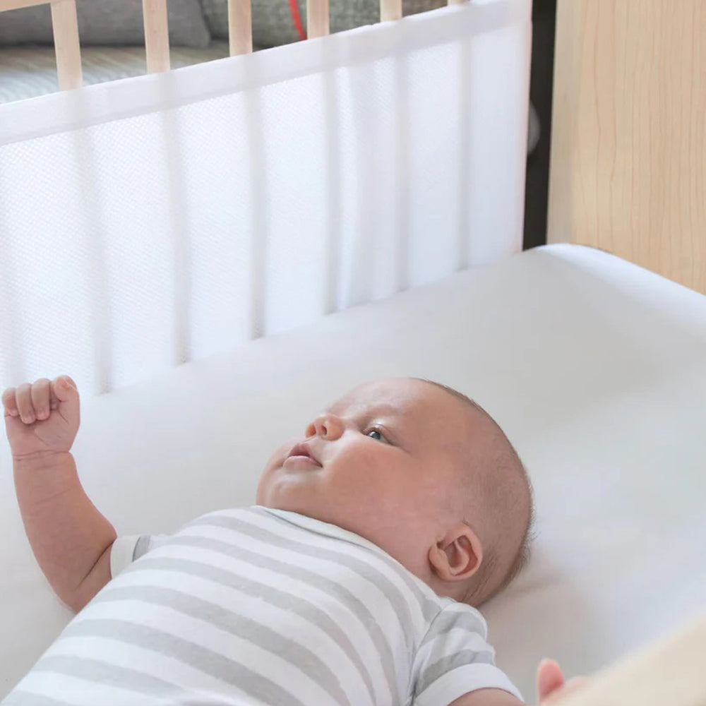Designed in Australia, the adjustable 2-sides cot liner mesh fits most rectangular cots with rails/slats on both sides and is machine washable.