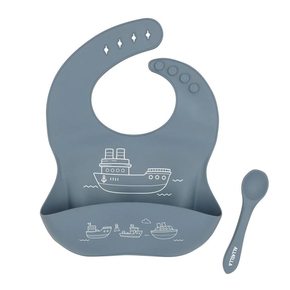 Made from soft, durable food-grade silicone, the Boats Slate Blue Silicone Catch Bib features a handy deep spill pocket to catch food and keep mealtimes mess-free. Packaged in a reusable pouch, it's convenient for on-the-go use.