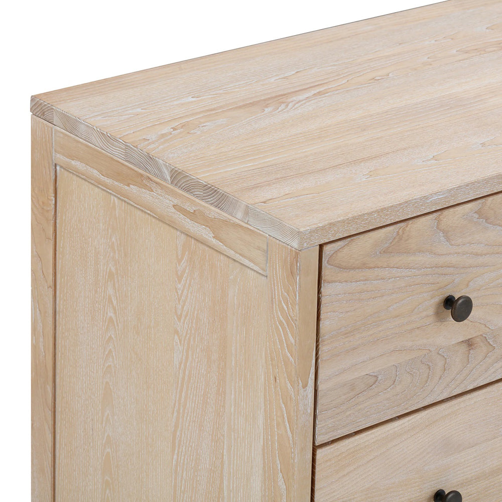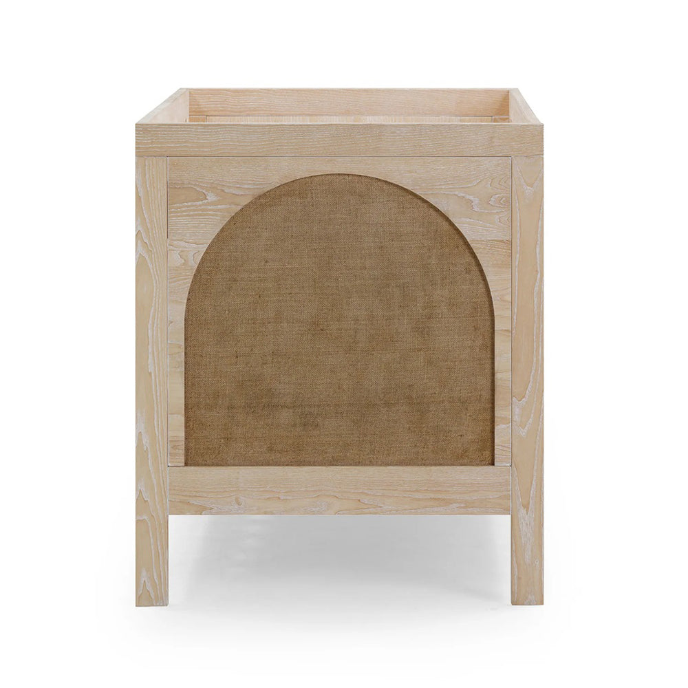 Crafted from durable European Ash with a light whitewash finish, the Grove Cot and Chest feature organic arches, rustic elements and hessian accents that bring nature indoors.Β