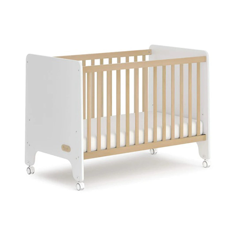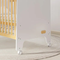 The Natty Compact Cot features a playful design with closed end panels, and wheeled feet, reminiscent of a figure on roller skates!