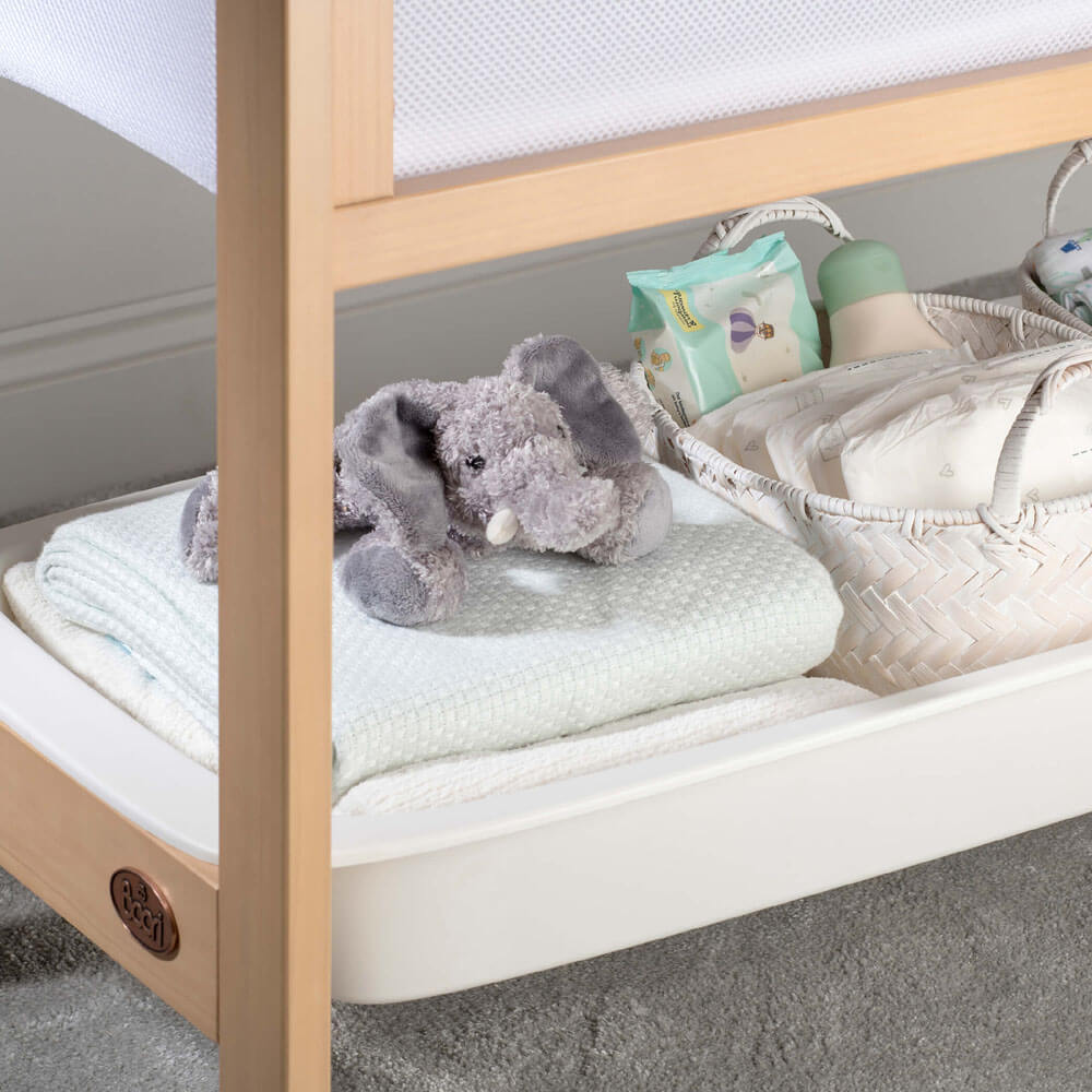These ergonomically designed storage trays can be used in three positions within the Tidy Bassinet, offering multiple practical functions in a classically understated design.
