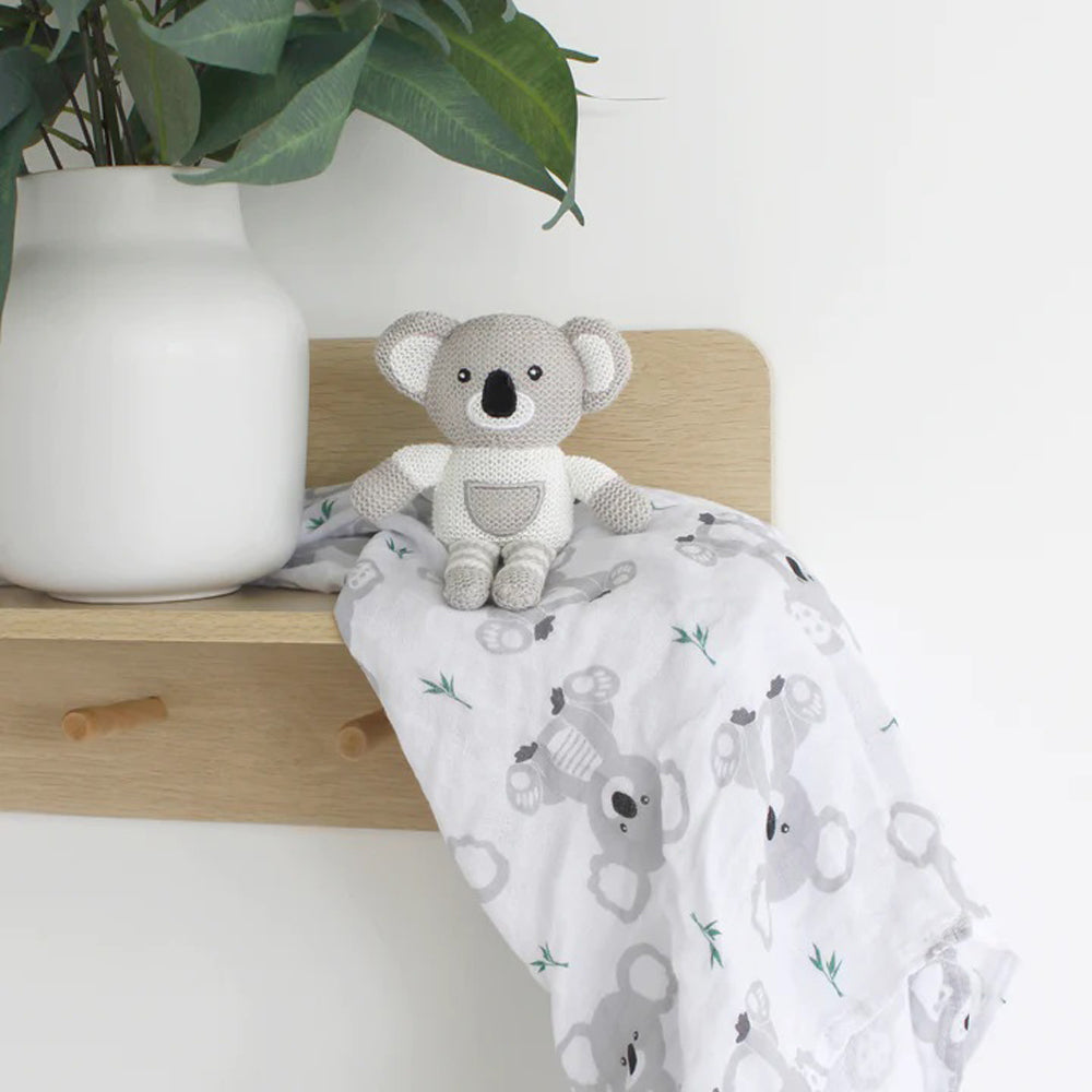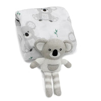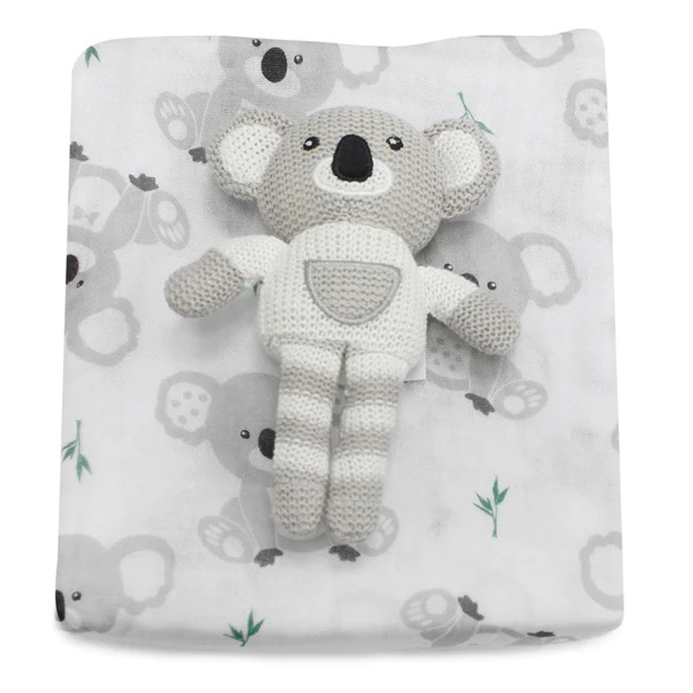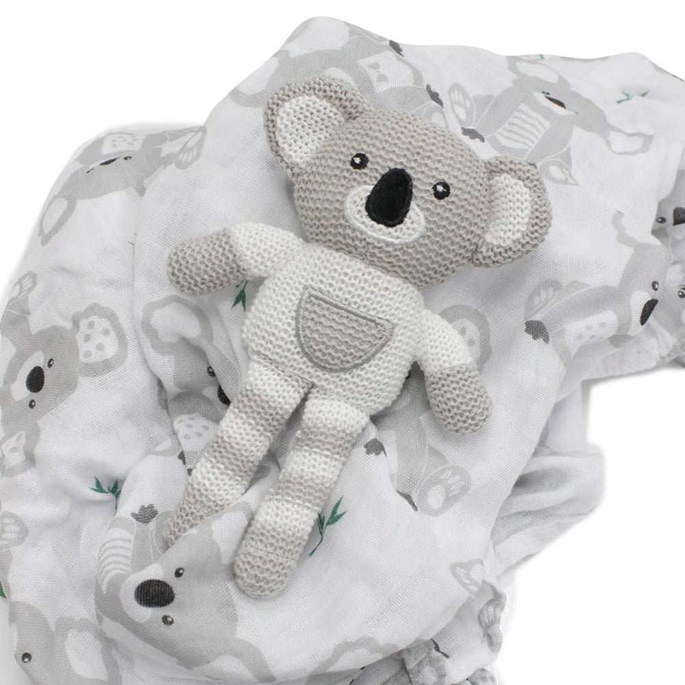 Little ones will love the softness of this pre-washed muslin wrap, whilst the soft knit texture and rattle sound of the Koala toy will stimulate their senses.