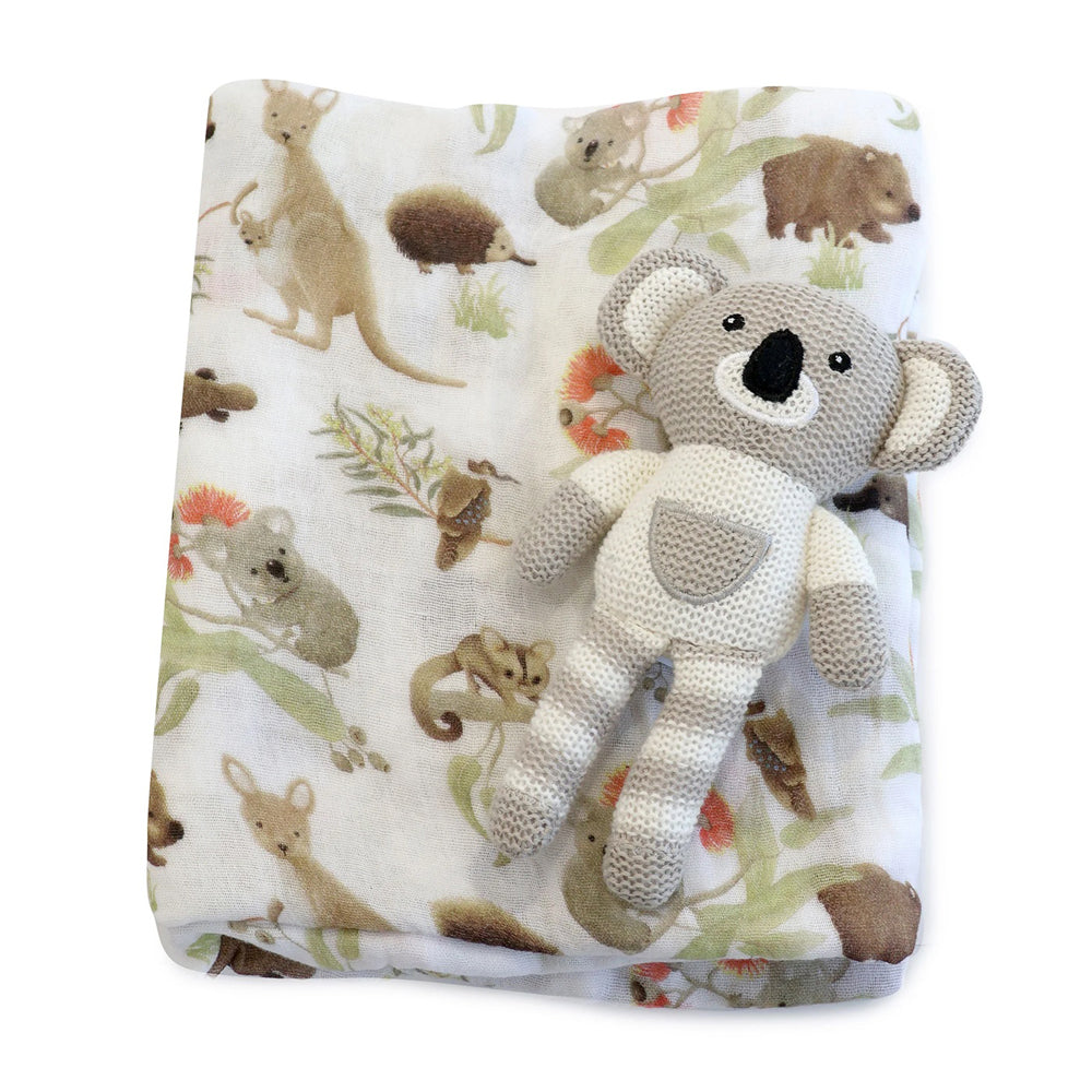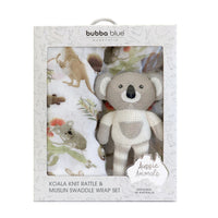 This gorgeous gift set from the Bubba Blue Aussie Animals collection includes a lightweight bamboo cotton muslin wrap and a charming knit Koala rattle toy, perfectly sized for little hands.