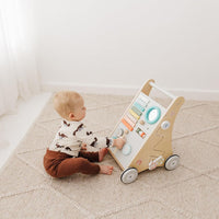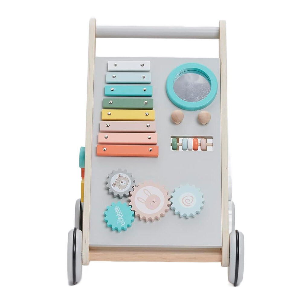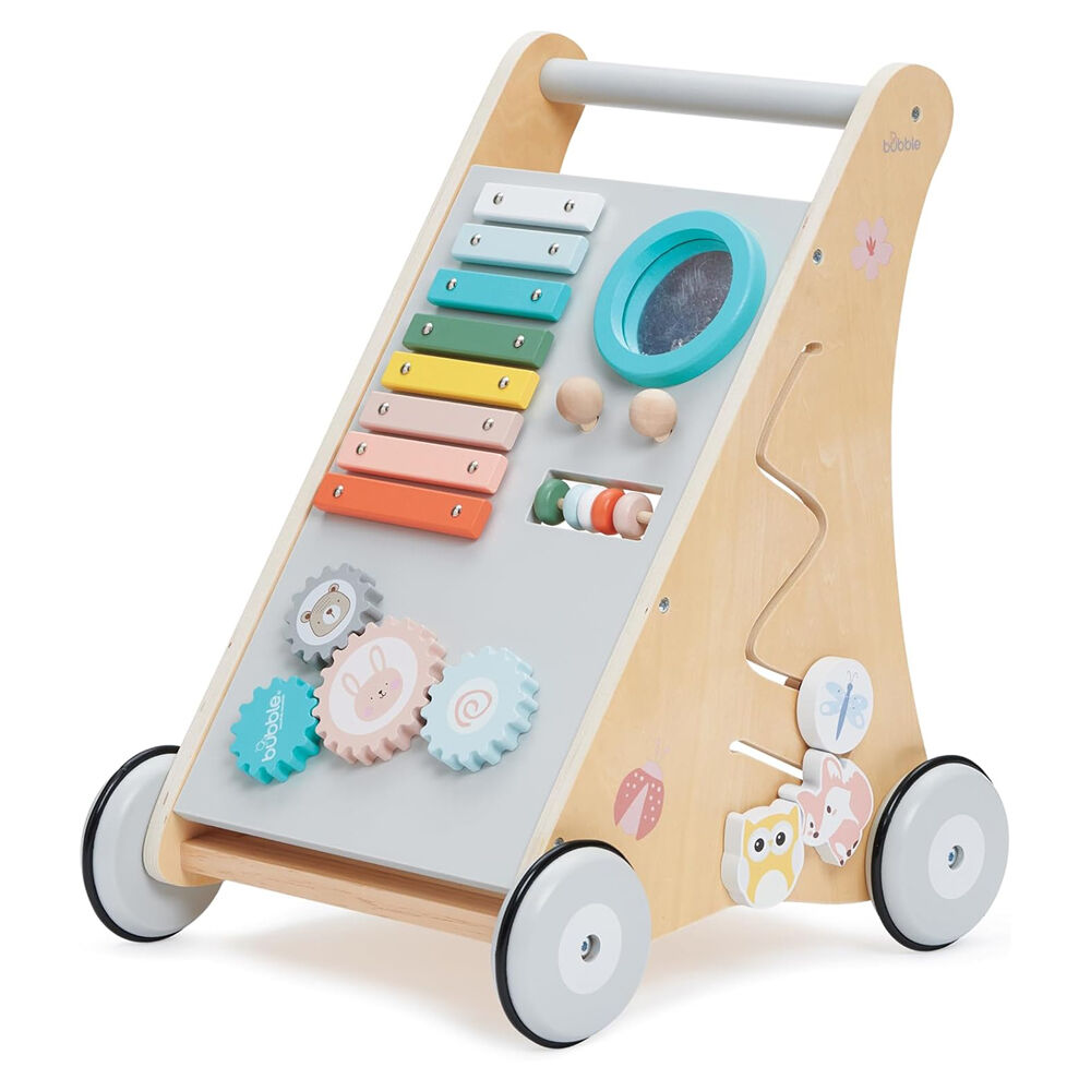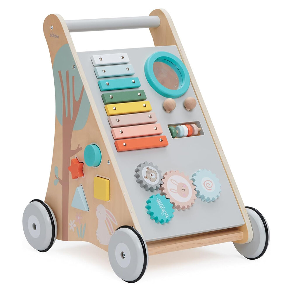 Bubble Wooden Activity Play Walker is a beautifully designed companion for your little one as they begin to walk. featuring seven entertaining activities, including a shape sorter, bead maze, spinning cogs and a mirror, this walker offers both fun and balance for your little adventurer. With an easy-grip handle and a storage basket for blocks, it encourages independent walking and creative play. It's a perfect addition to any nursery.