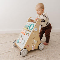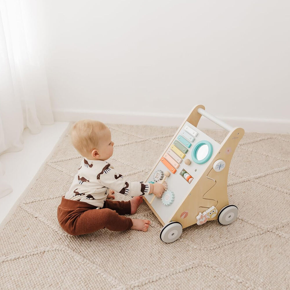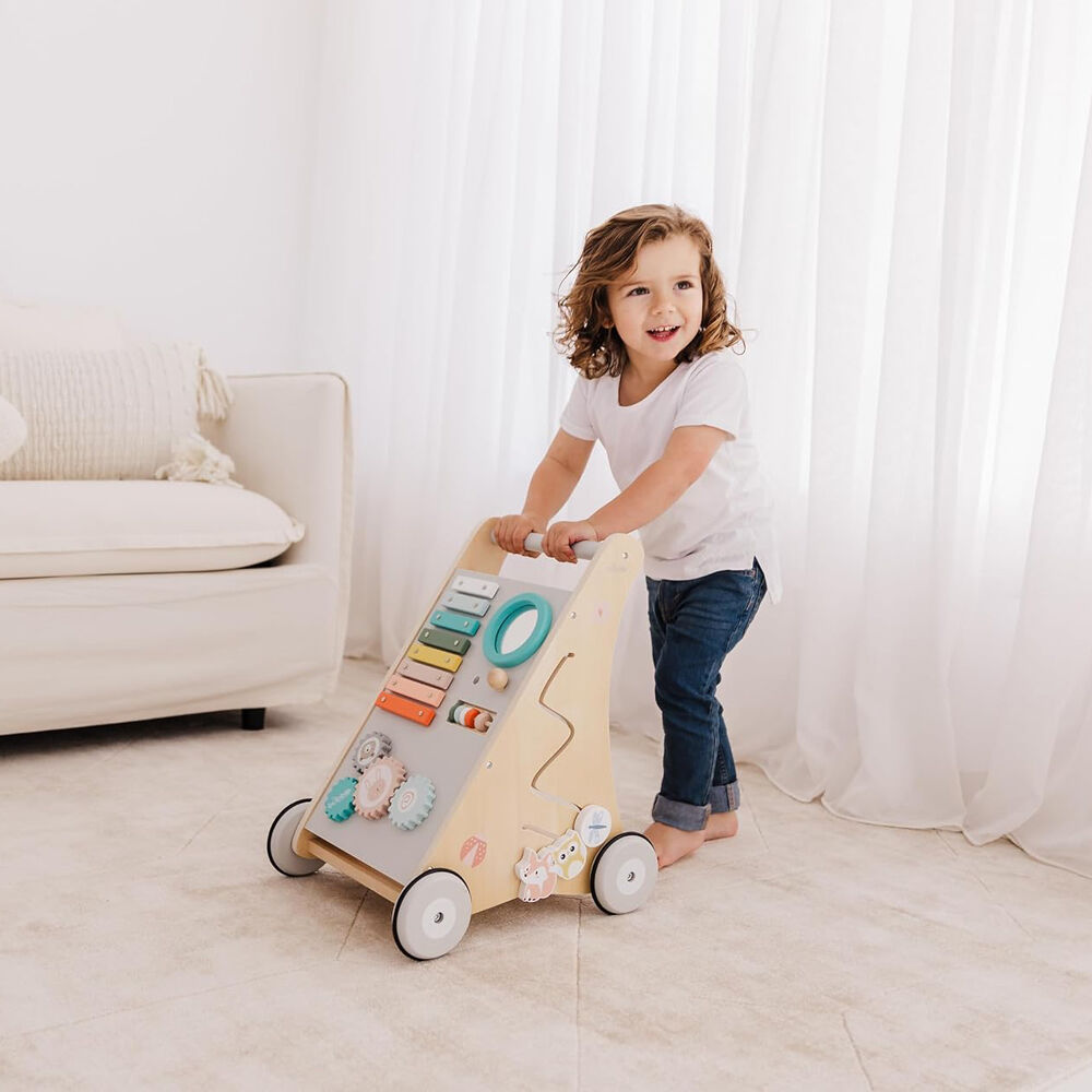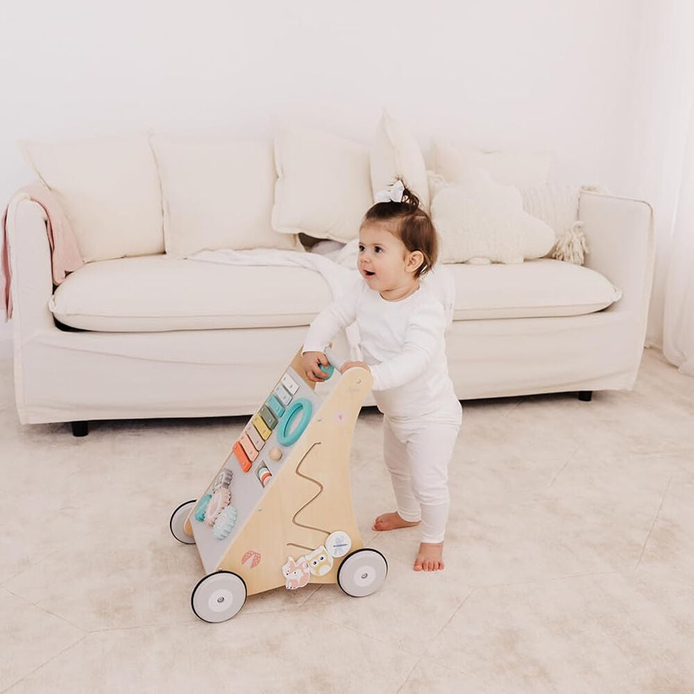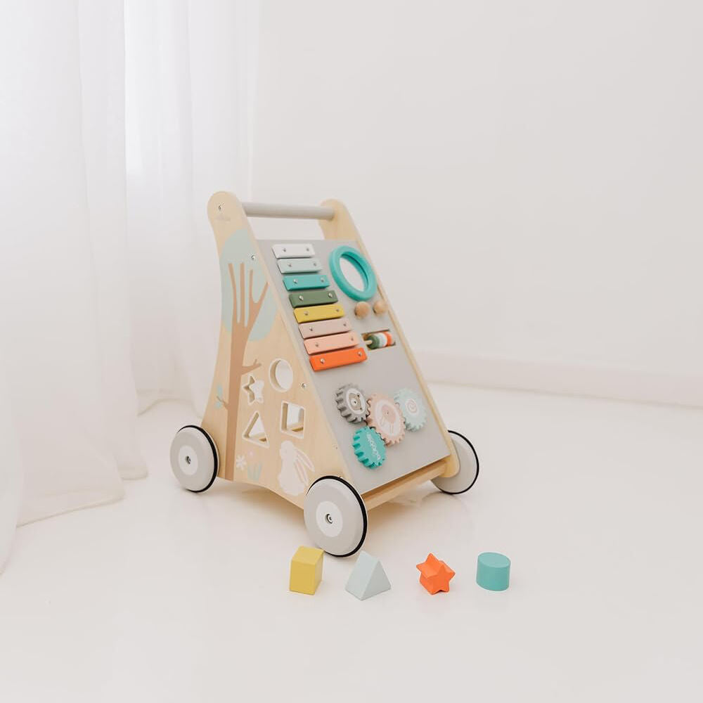 Bubble Wooden Activity Play Walker is a beautifully designed companion for your little one as they begin to walk. featuring seven entertaining activities, including a shape sorter, bead maze, spinning cogs and a mirror, this walker offers both fun and balance for your little adventurer. With an easy-grip handle and a storage basket for blocks, it encourages independent walking and creative play. It's a perfect addition to any nursery.