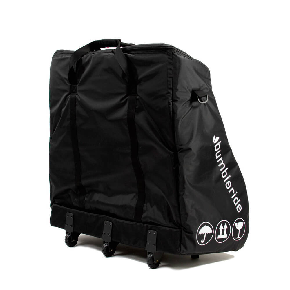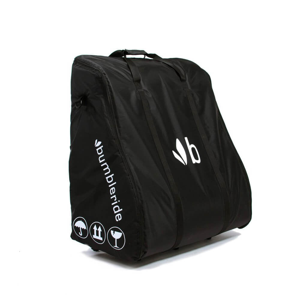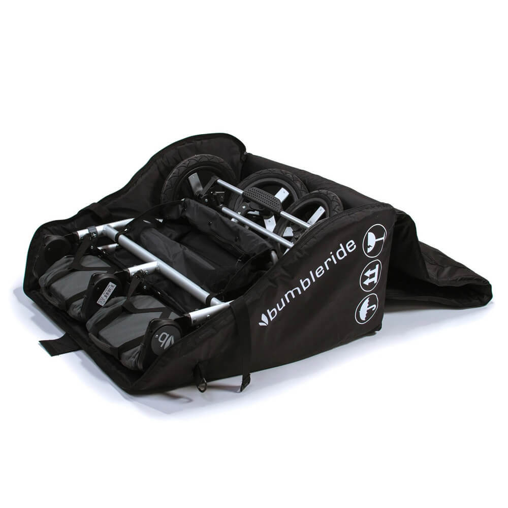 The Bumbleride Indie Twin Travel Bag features a tough weather-resistant exterior, reinforced carry handles, shoulder strap, and padded interior.