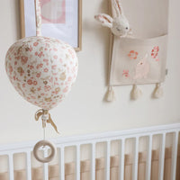 The mobile is shaped as a balloon with a little bow in cotton tape.