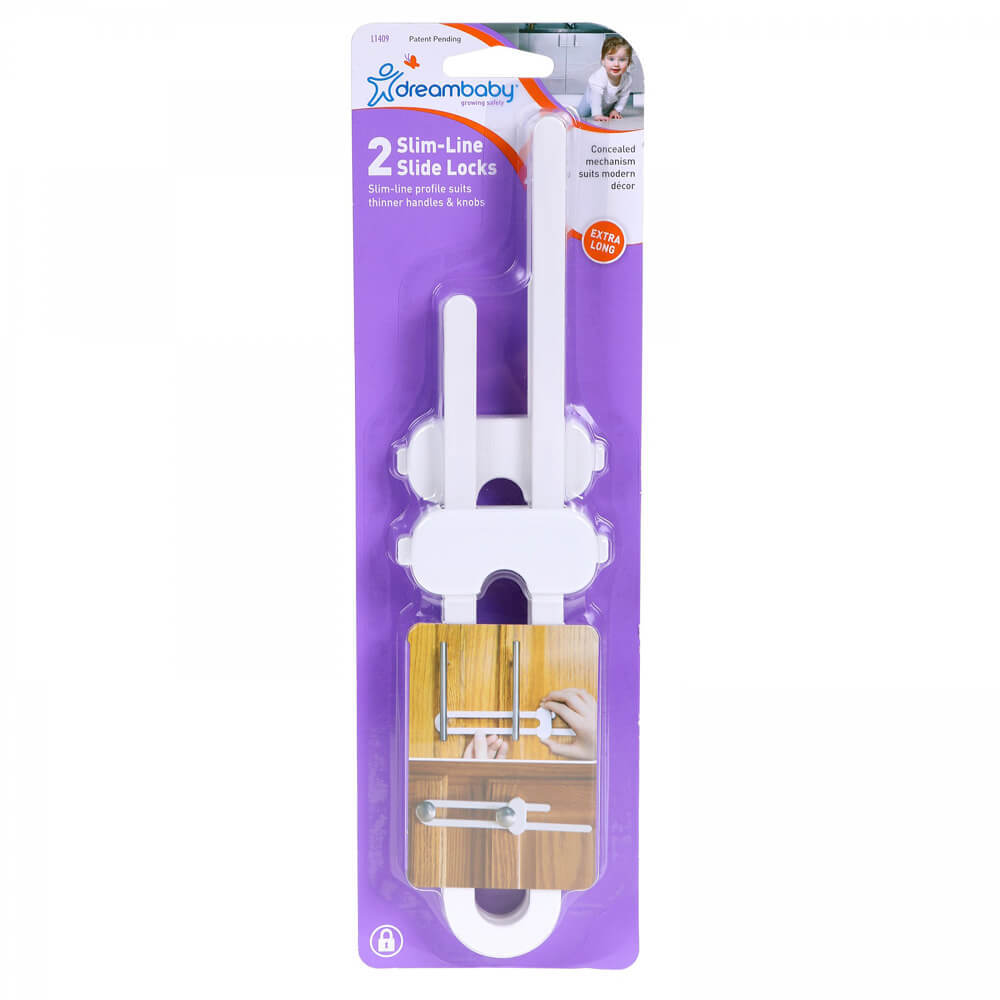 Dreambaby Slim-Line Slide Lock fits easily to cabinet knobs or D-Shaped handles. Closes with a simple sliding action helping keep children out of cabinets.