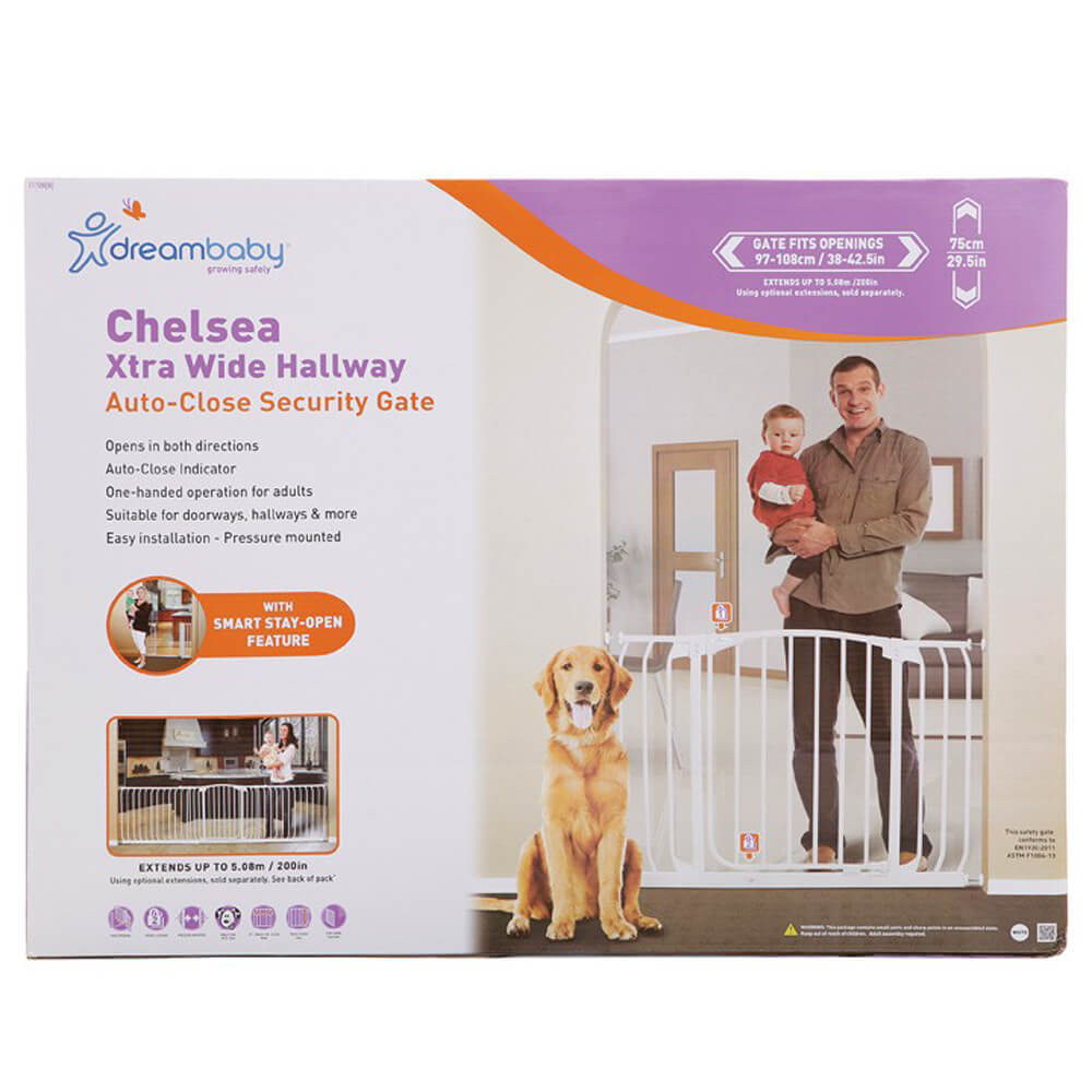 Dreambaby Chelsea Xtra-Wide Hallway Auto-Close Security Gates are a perfect way to add safety and security to your childproof home. They are suitable for openings between 97-108cm (38.1-42.5"). With optional extensions, they can fit openings up to 5.04m (198.5").