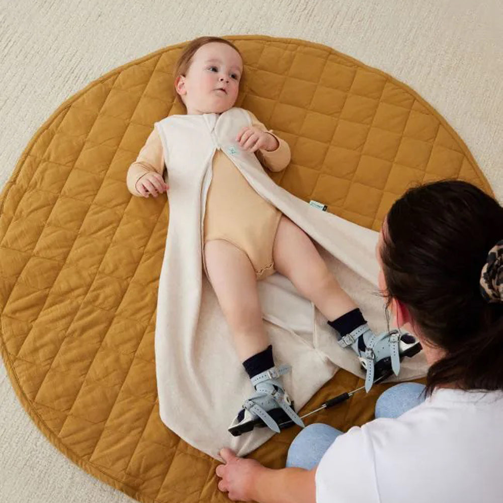 Parents can follow the FREE room thermometer and What to Wear guide provided with the 1.0 TOG hip dysplasia sleeping bag to layer appropriately underneath to keep their child warm. We recommend pairing this pouch with one of the TOG-rated Layers or Bodywear underneath, and Arm Warmers can be added on top of the pouch for extra warmth (all sold separately, we suggest going up a size in Layers to fit over a harness or brace).