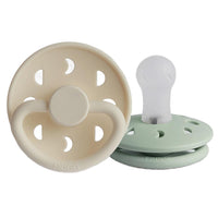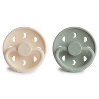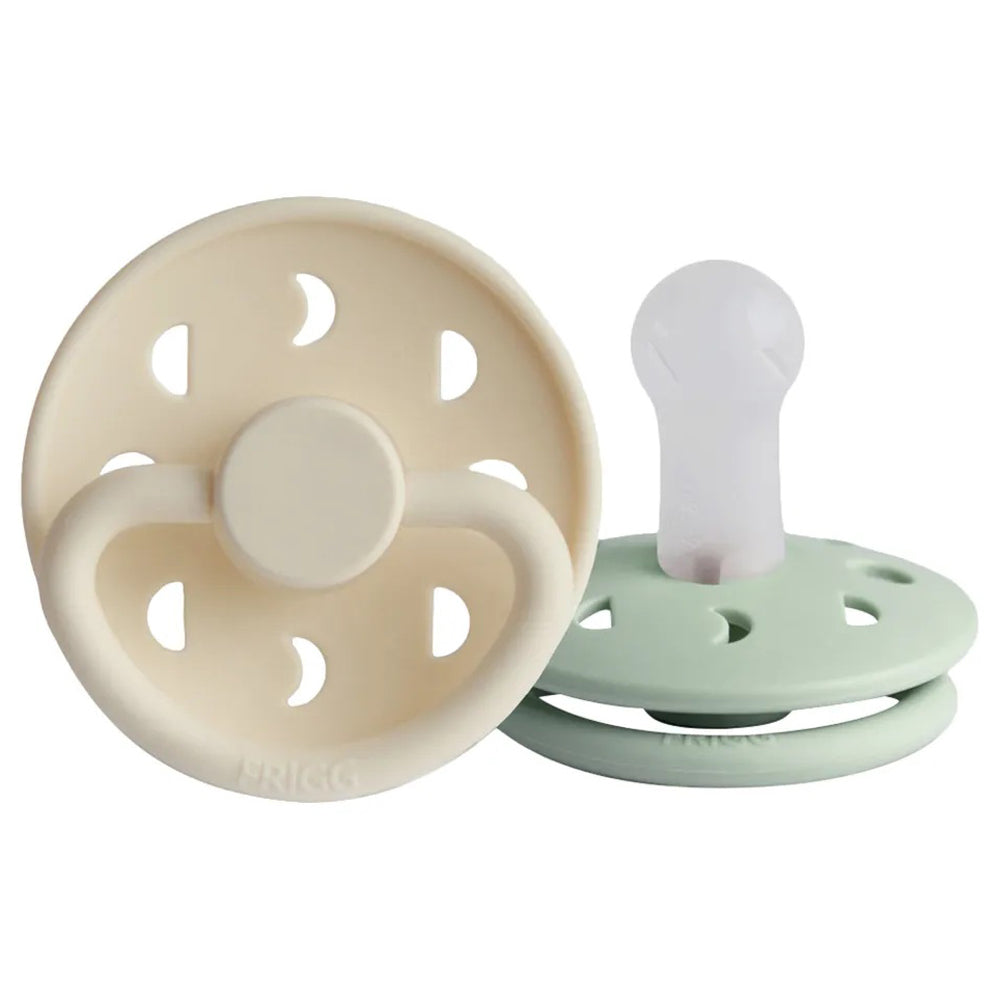 The FRIGG line of moon phase silicone pacifiers with improved SilkySoft nipple and an innovative Click-lock System has been thoughtfully designed for your baby's comfort and inspired by the moon in motion. The outward curve keeps the pacifier off their delicate skin, while features like air holes and a security handle ensure your baby stays safe. Within the pacifier shield, air holes reveal the eight phases of the moon in subtle detail. FRIGG pacifiers make a beautiful addition to your collection of baby essentials.