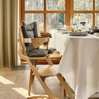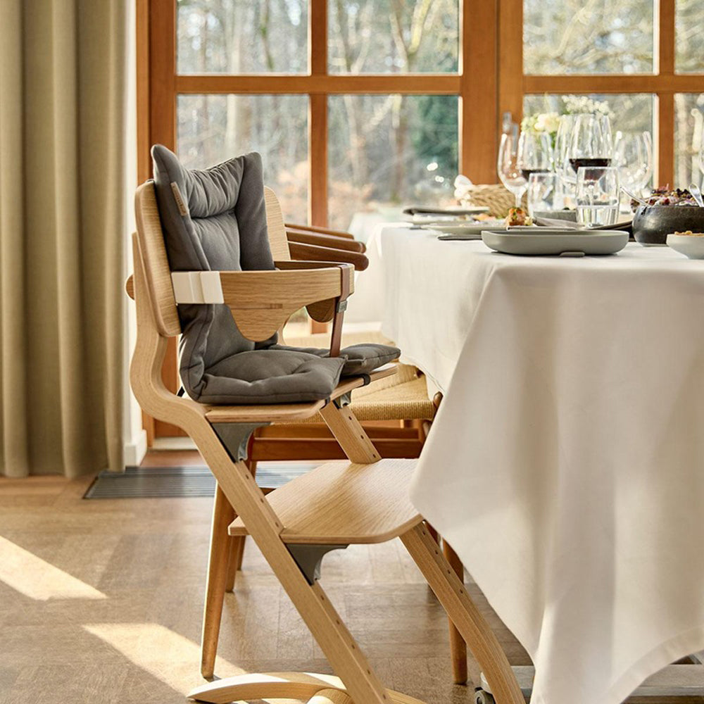The high chair cushion is custom-made for Leander highchairs and follows the shape of the chair. The cushion adds extra support to your child's back and makes the chair even more comfortable. The perfect fit ensures that your child is safely seated and secure.