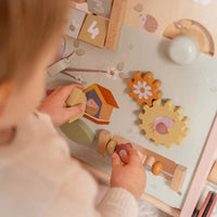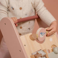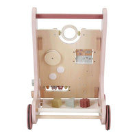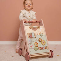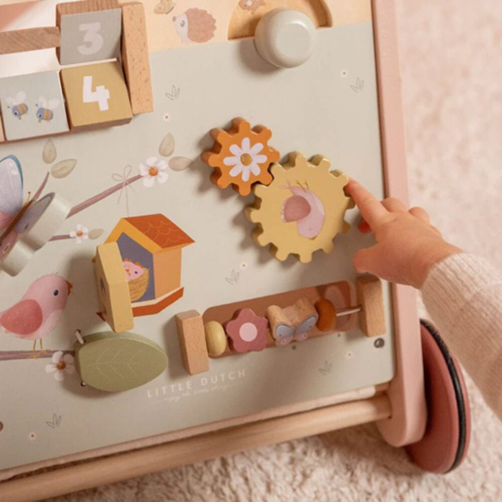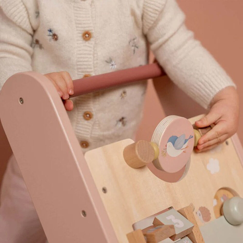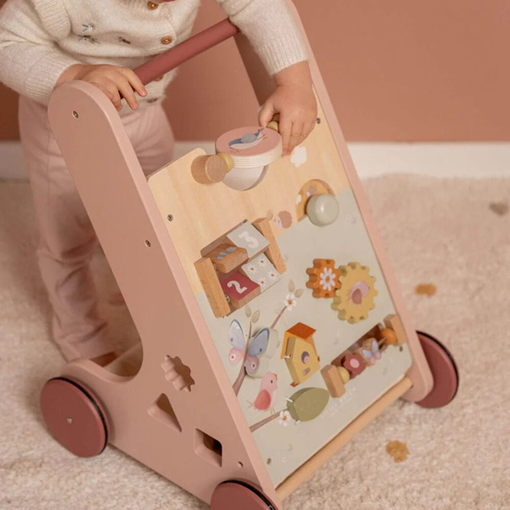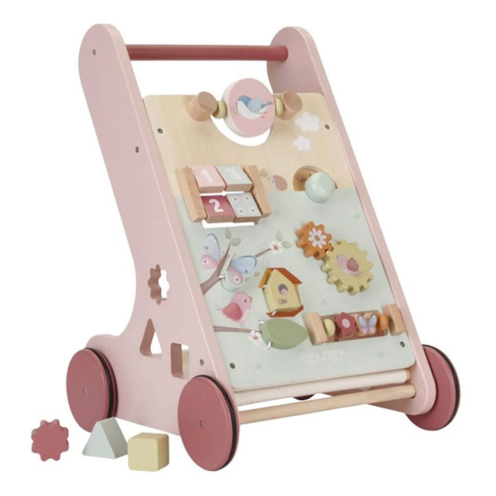 And off you go! Embark on an adventure through the living room with this pink push cart. Step by step, youâll learn to walk, and this push cart will help you along the way. So, rev up your engine and pretend to be the driver of this push cart with subtle floral details and a touch of vintage charm. The wooden pink push cart isnât just handy for assisting your little oneâs first steps, but its design also doubles as a perfect toy chest for your baby.