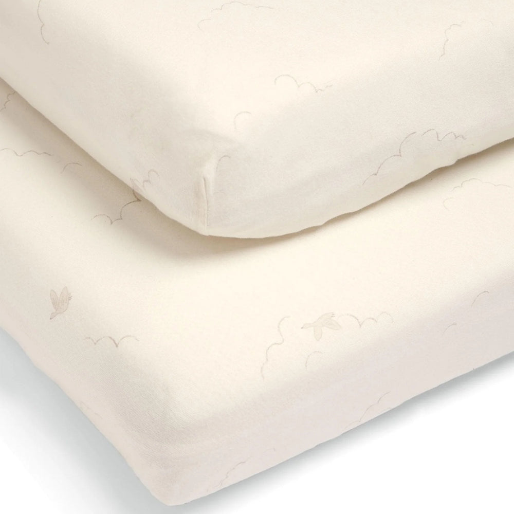 2 fitted cot bed sheets, in this range’s iconic flying duck and cloud prints. Hand painted design in soft beiges against cream base. Super soft jersey cotton, ultra-soft and machine washable, these are durable yet kind on babies’ skin.