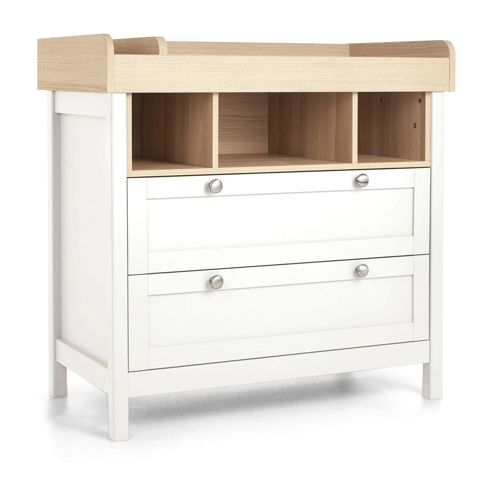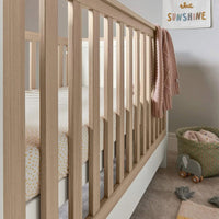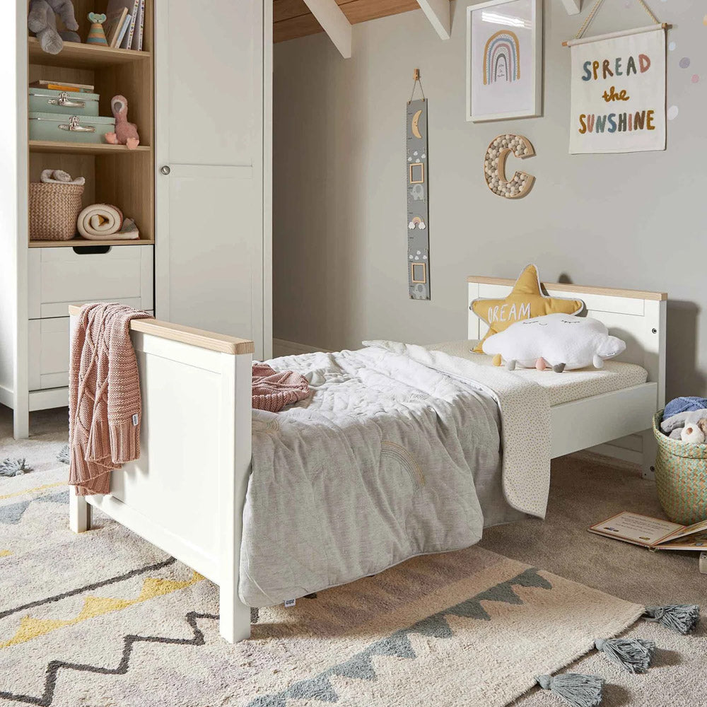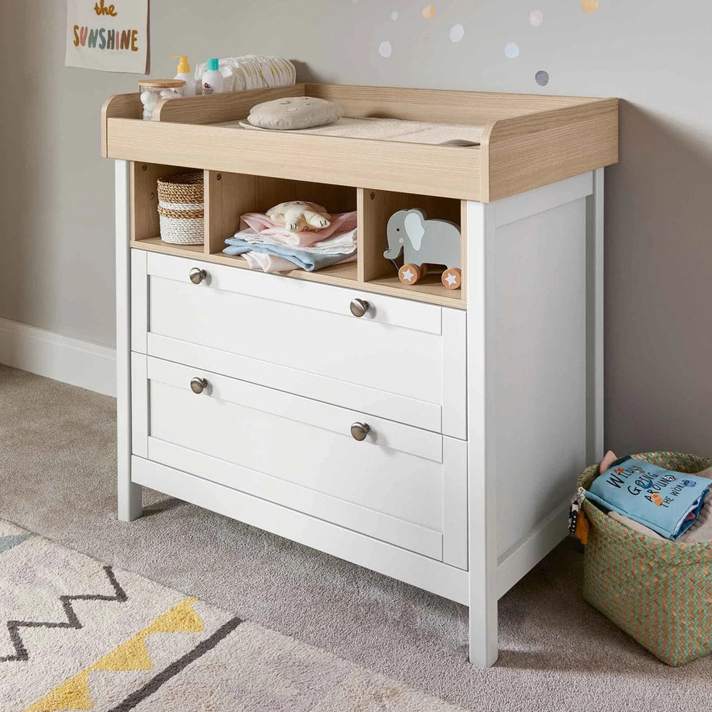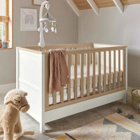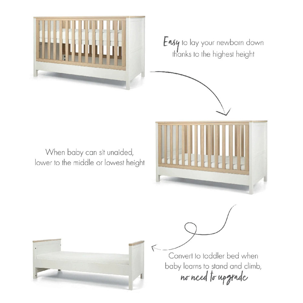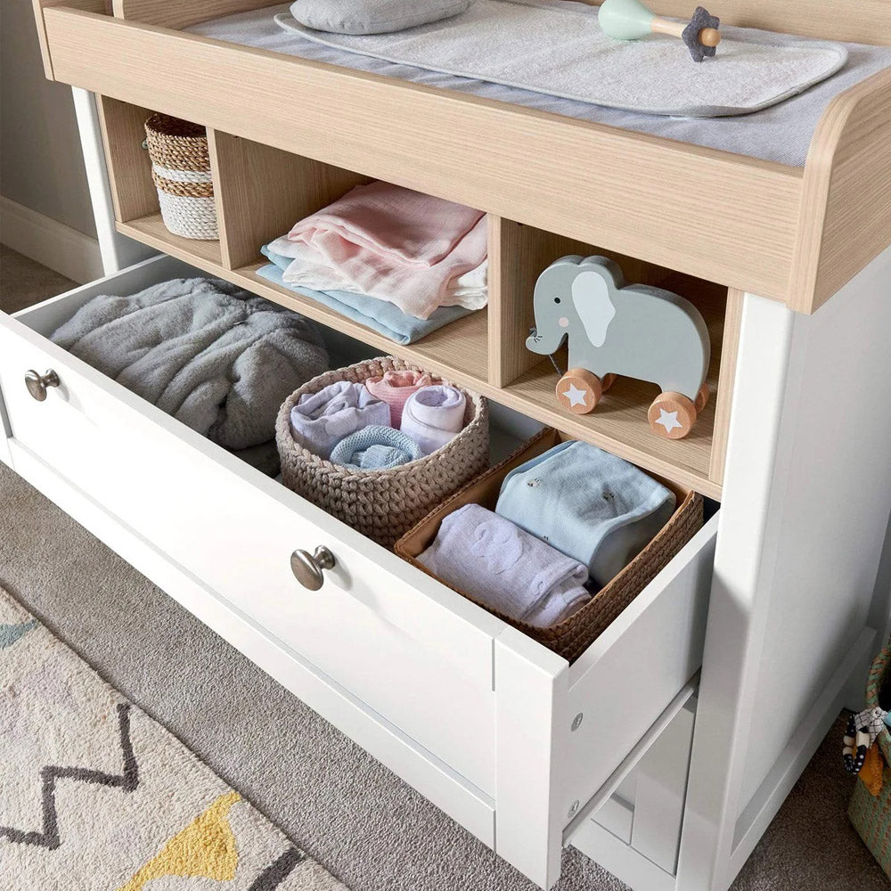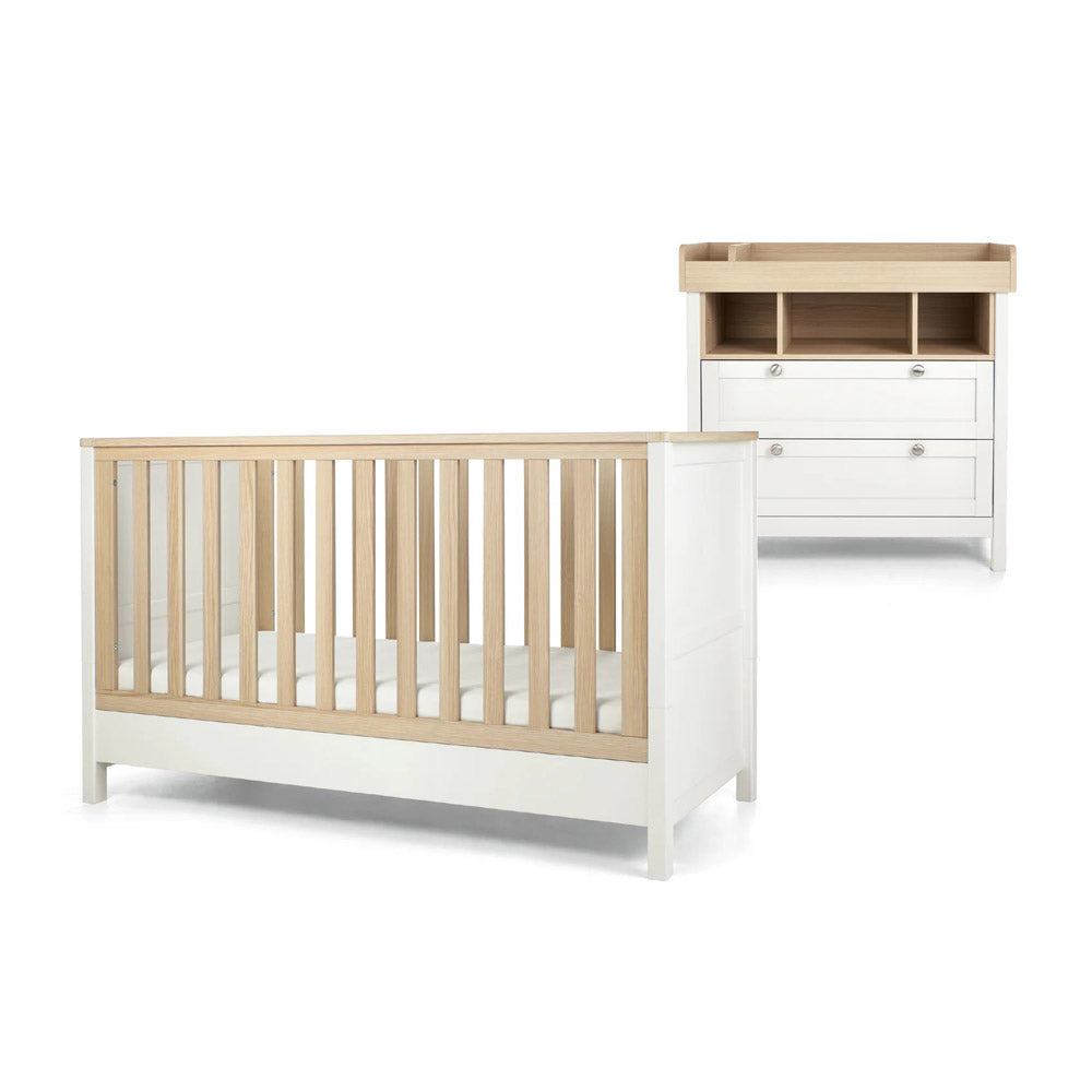 This 2 piece Harwell cot bed and dresser changer set has your nursery essentials covered. The cot bed has 3 adjustable base heights and easily converts into a toddler bed, whilst the dresser changer has a removable top - so you won't need to upgrade your furniture when your little one has a growth spurt. And thanks to the drawers and storage on the dresser, there'll be plenty of room for all of those clean outfits.