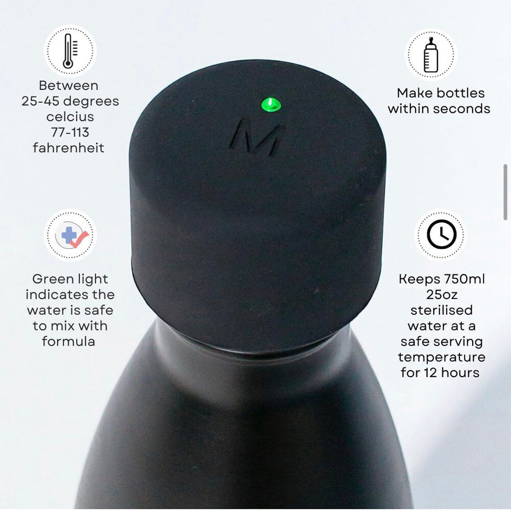 The 750ml/25oz insulated bottle keeps sterilised water warm for up to 12hrs. With an inbuilt temperature light indicator located in the lid, Missta lets you know whether the water is at a safe serving temperature to mix with formula when feeding infants.Â