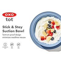 Cut down on mealtime mess with the OXO Tot Stick & Stay Suction Bowl. The Bowl features a suction base that sticks securely to surfaces until mealtime is over, preventing sliding, slipping and tipping.