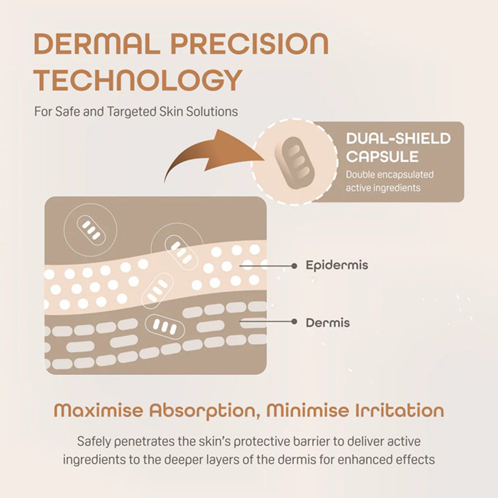 Powered by Dermal Precision Technology, the formula uses dual-shield capsules (double-structured lipid vesicles) to transport active ingredients through the outer skin layers and release them into the deeper layers where they are needed most. This ensures maximum absorption, minimal irritation, and visible improvements in skin texture and elasticity.