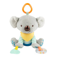 A soft toy and teether toy filled with textures, patterns and sounds! Little hands stay active as baby explores rattles, crinkles and more. This colourful characterโs soft bandana teether toy detaches for mum to wear around her wrist for quick access. Perfect for multi-sensory play, this cute companion is ideal for fun at home or-on-the-go