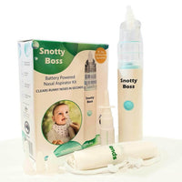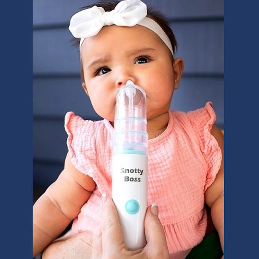 The Snotty Boss is a battery powered nasal aspirator kit, that helps your child breathe, feed and sleep better, by clearing runny noses.