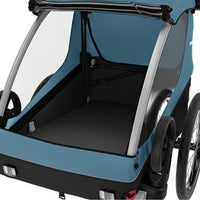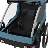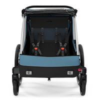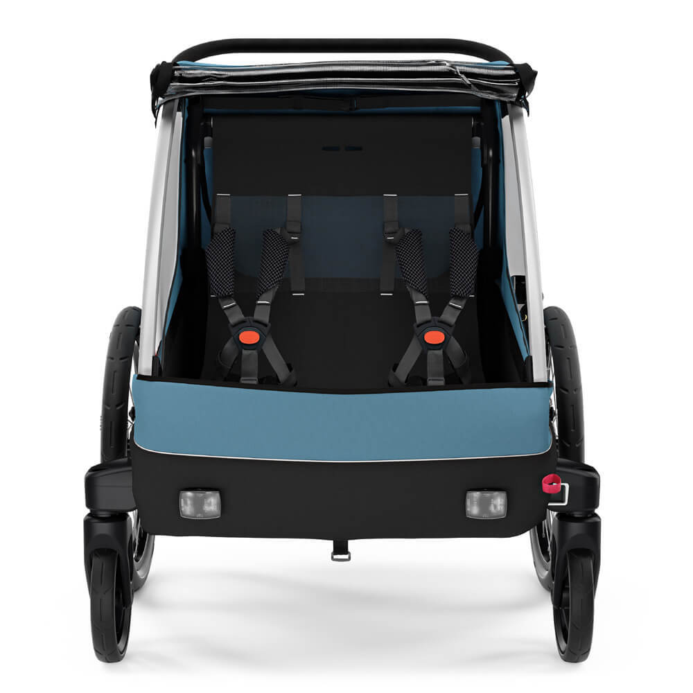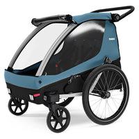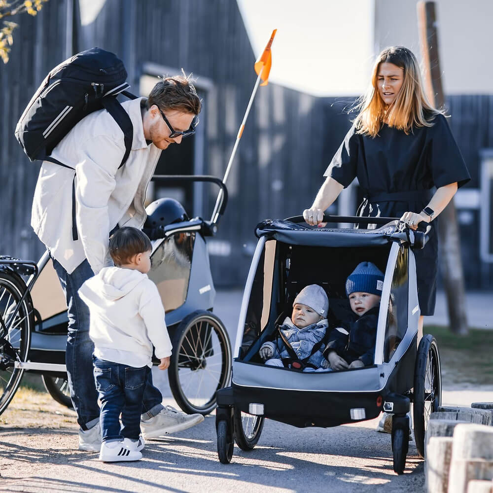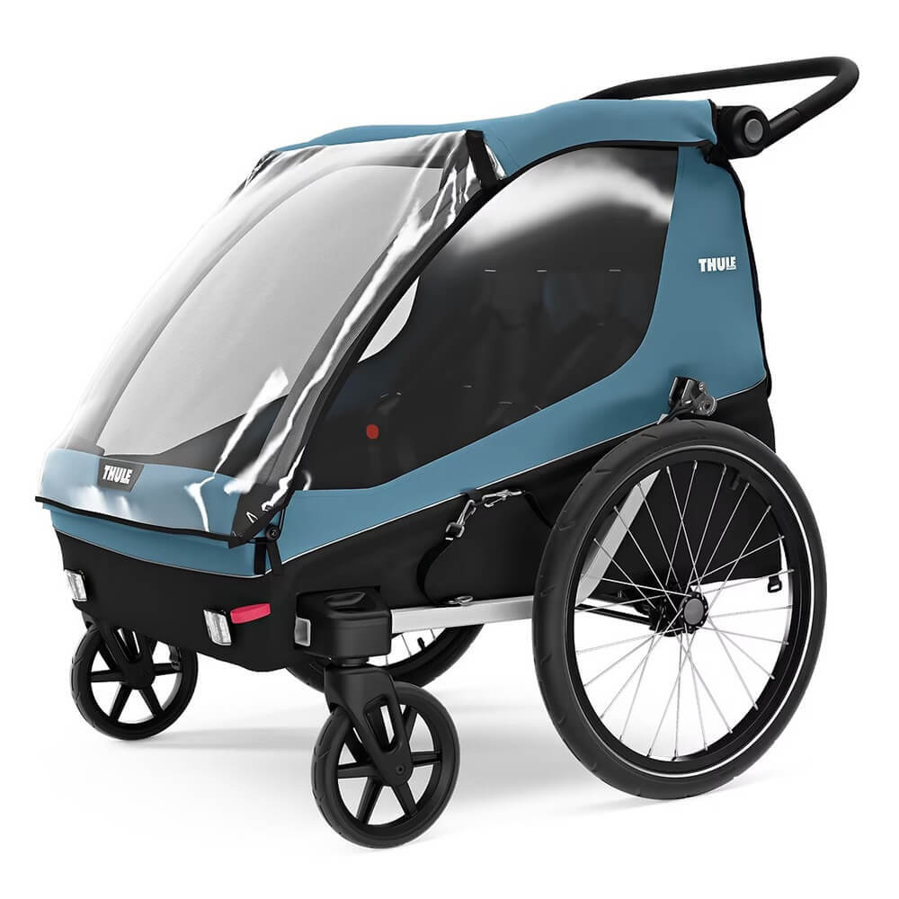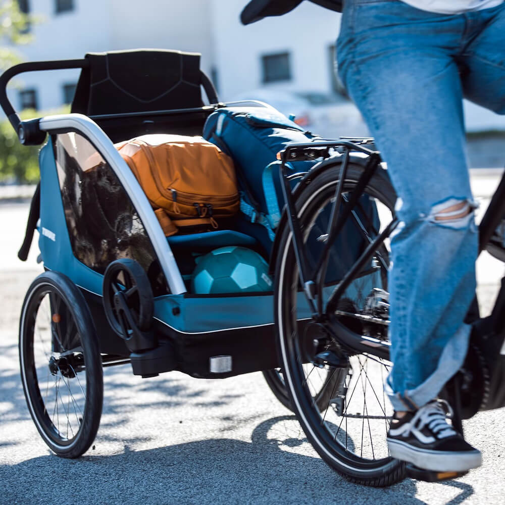 Thule Courier is a versatile bike trailer for all types of families. This durable carrier is perfect for long rides as a family or for quick trips into town with its roomy cockpit for two children. Itβs great for commuting and taking kids to school β and when you arrive, it easily converts into a stroller with compact wheels for maneuvering in crowded areas and a fully adjustable handlebar for parents. This comfortable bike carrier also features the option to fully convert into a cargo trailer and more.