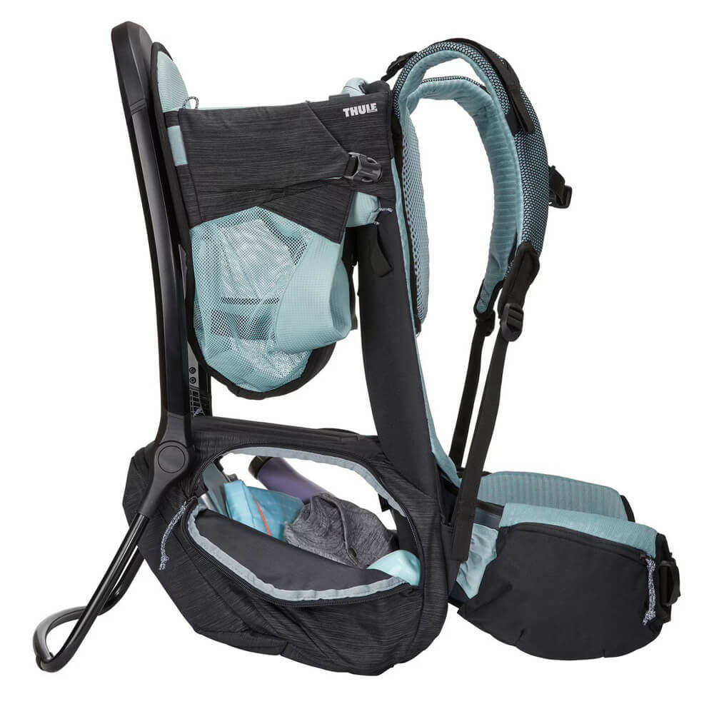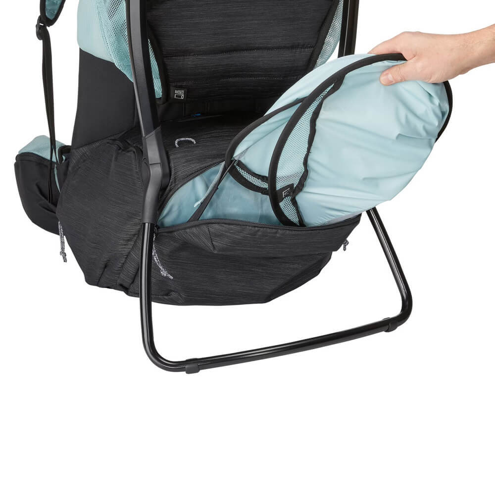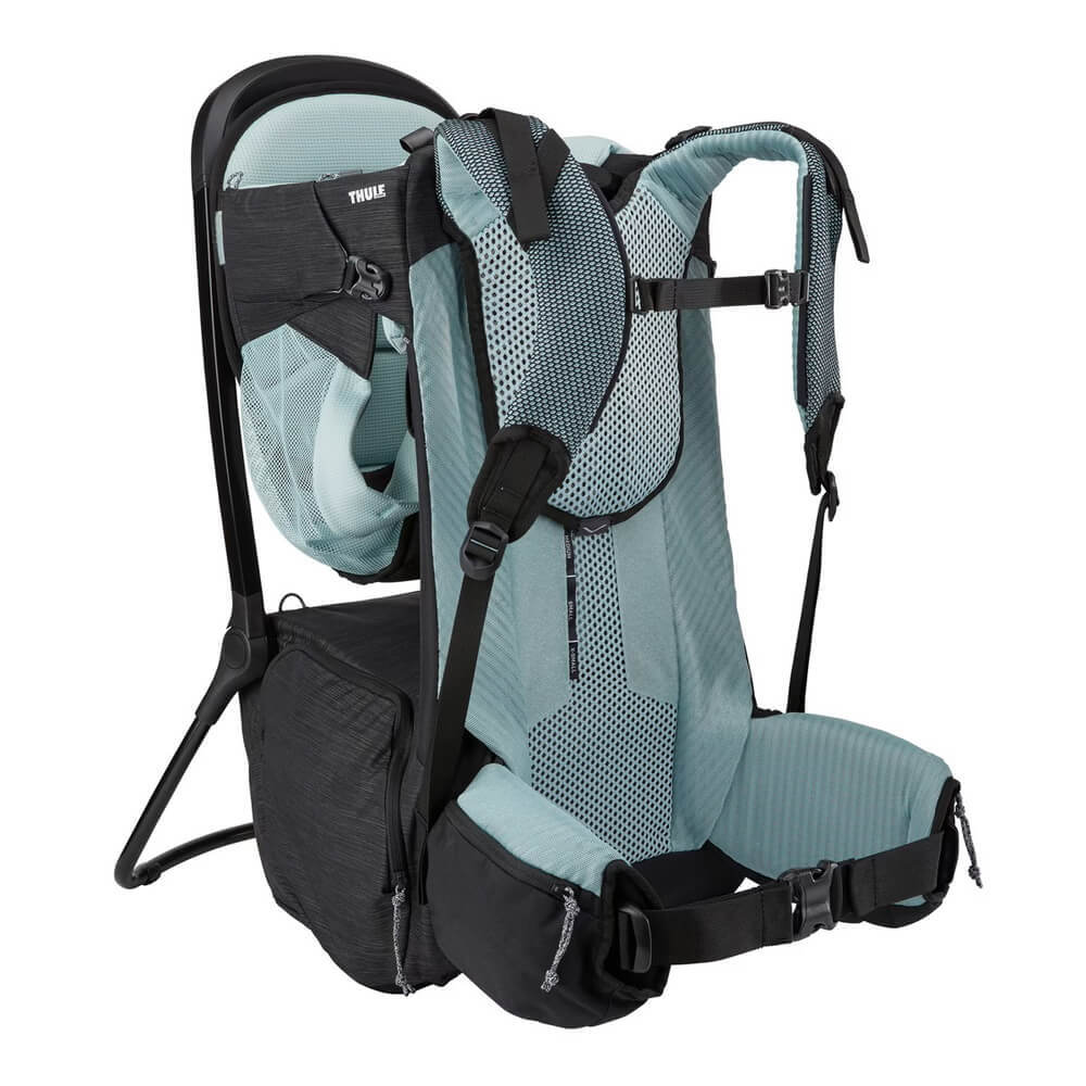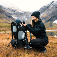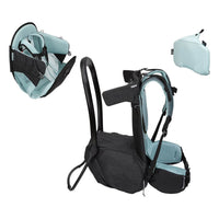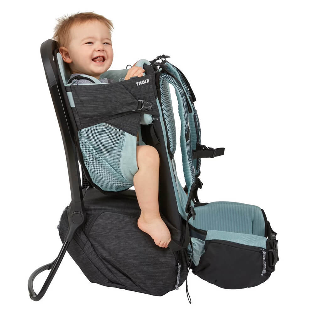 A child carrier backpack with a machine washable child seat provides under leg support to maximise comfort on any adventure.