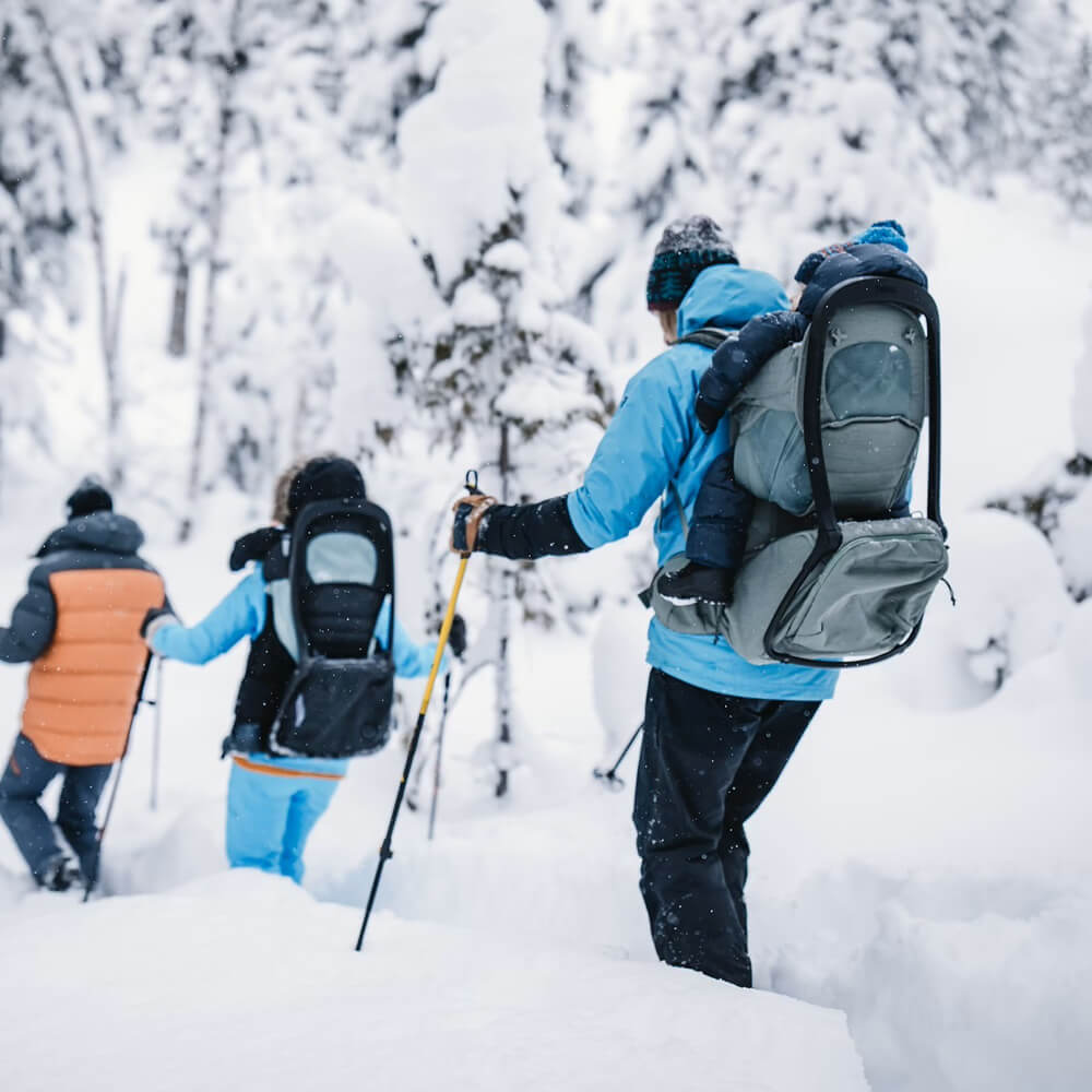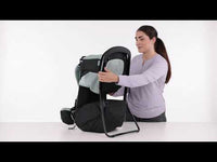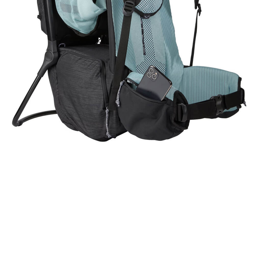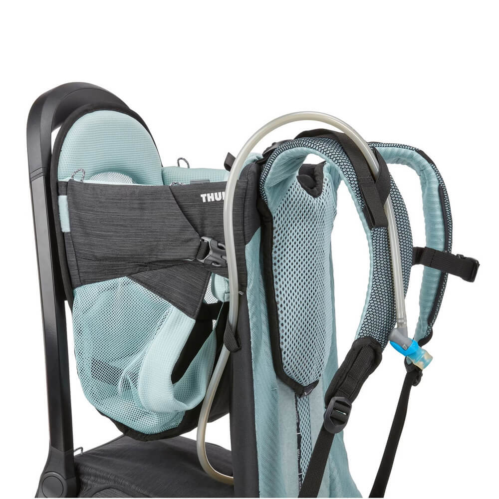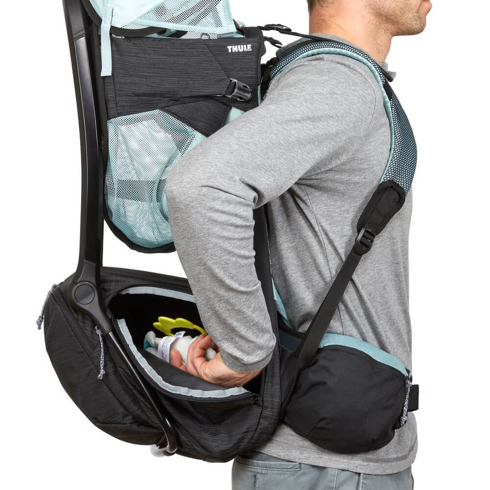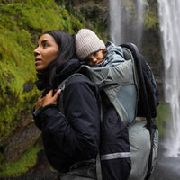 A child carrier backpack with a machine washable child seat provides under leg support to maximise comfort on any adventure.