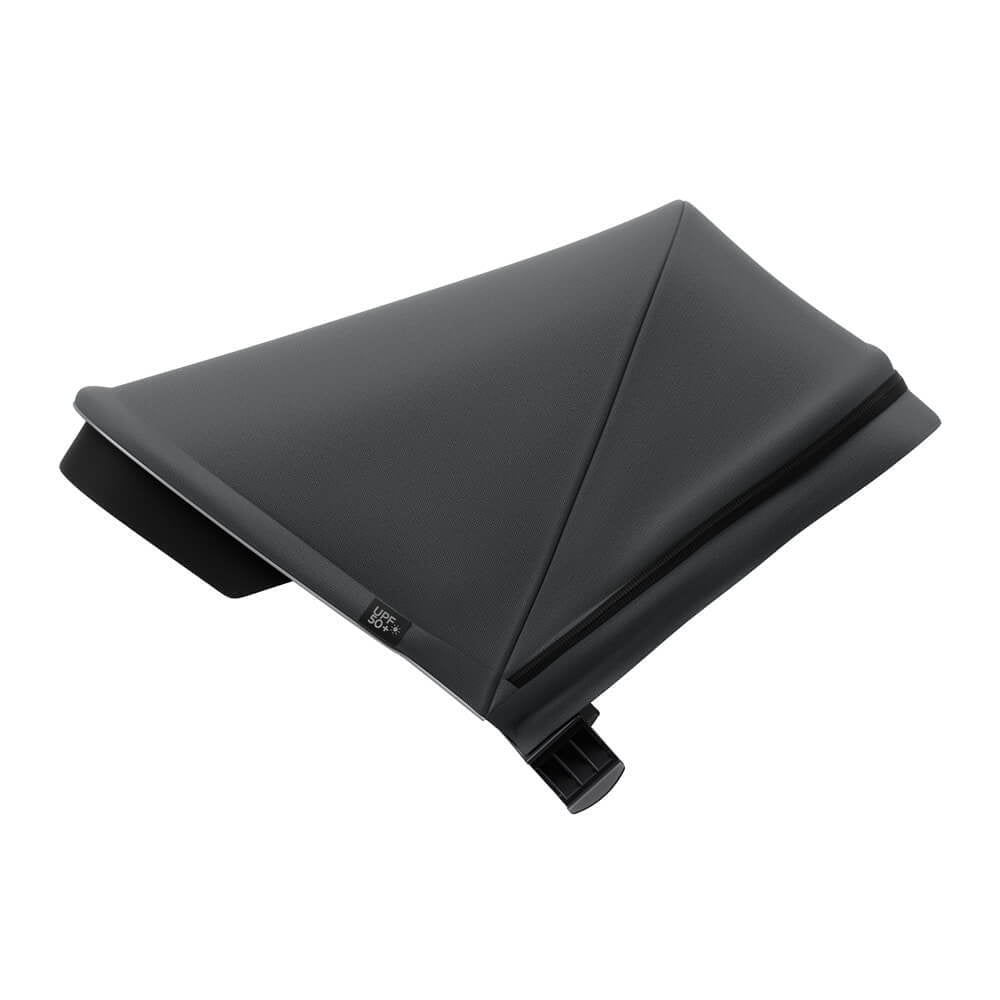 It is an adjustable canopy with integrated extension that shields from low sun and provides UPF 50+ UV protection.