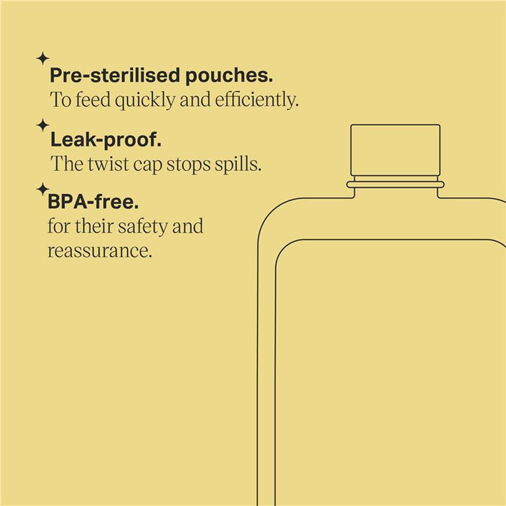 When ready to use, simply warm your milk in the pouch then slot into the specially designed, easy-to-hold holder (sold separately) and twist on a bottle teat of your choice.