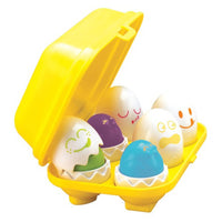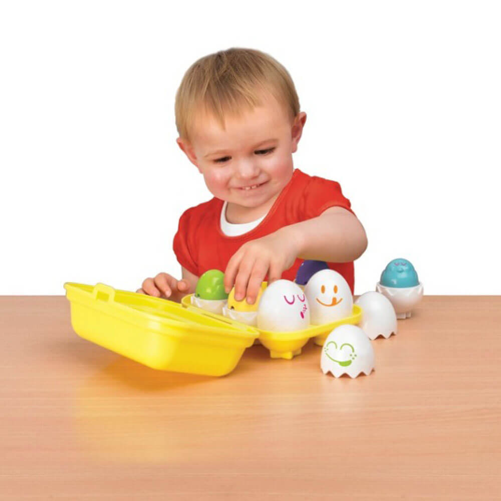 Cheep Cheep! Let's play hide and squeak! Can you match my shapes to the egg carton - They have lots of silly faces for you to find. Push the eggs and make them give a cheeky chick squeak!