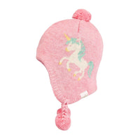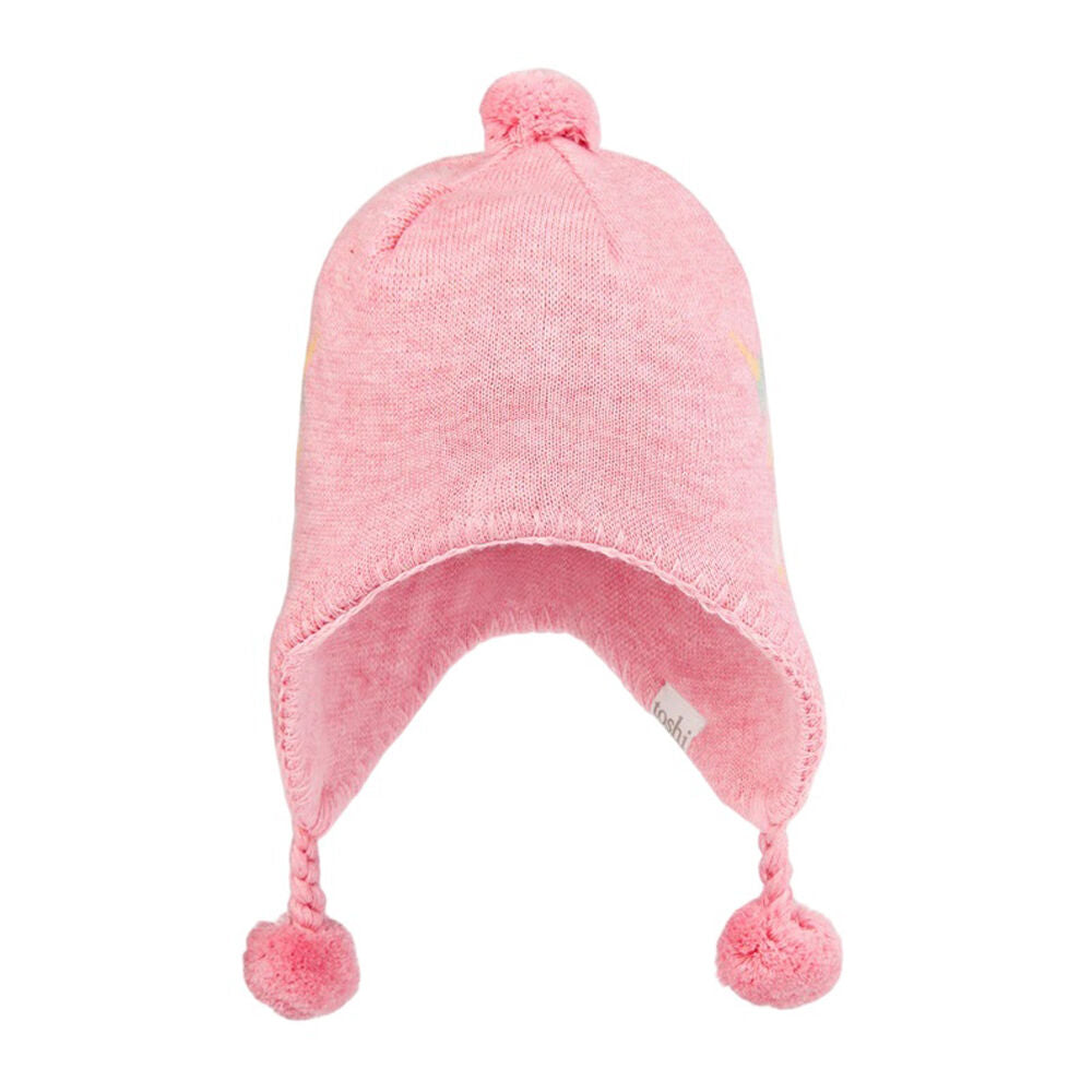 The beautifully textured melange yarn brings an element of refinement to the beanie. This beanie features ear flaps for cosy and nurturing protection from the elements. Pom poms introduce a whimsical and playful style.