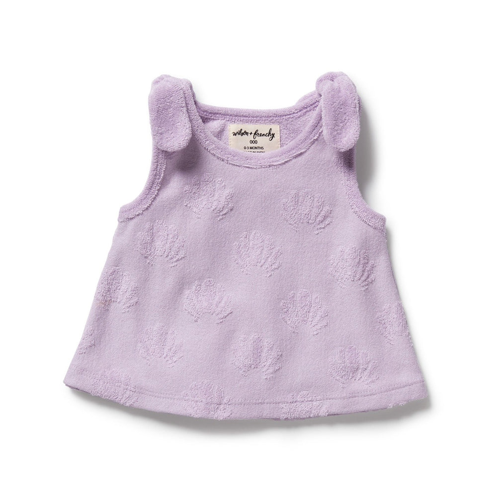 Made from GOTS-certified organic cotton terry towelling, this sweet swing top is perfect for sun-filled days. Featuring an all-over lavender sea shell jacquard pattern, itβs light, breezy, and easy to throw on after a swim or during playtime.
