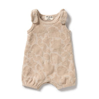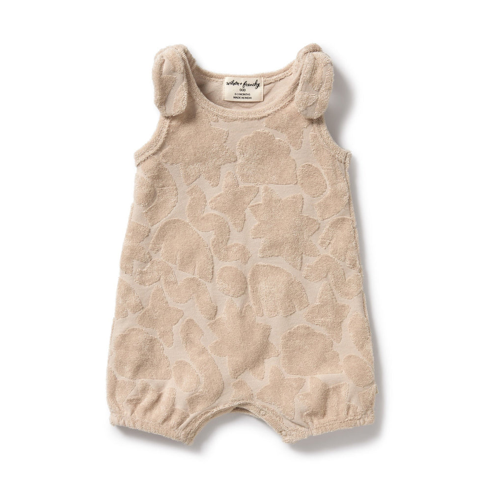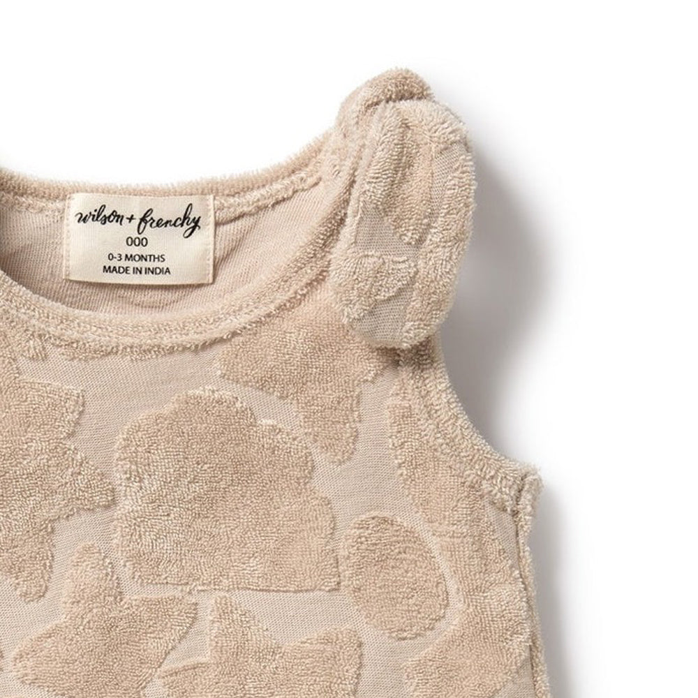 Introducing this organic terry towelling playsuit by Wilson and Frenchy. Perfect for little ones on the move, this roomy fit allows for maximum playtime while the soft elasticated leg openings provide comfort. Plus, with fixed shoulder ties, there's no need to worry about them coming undone.